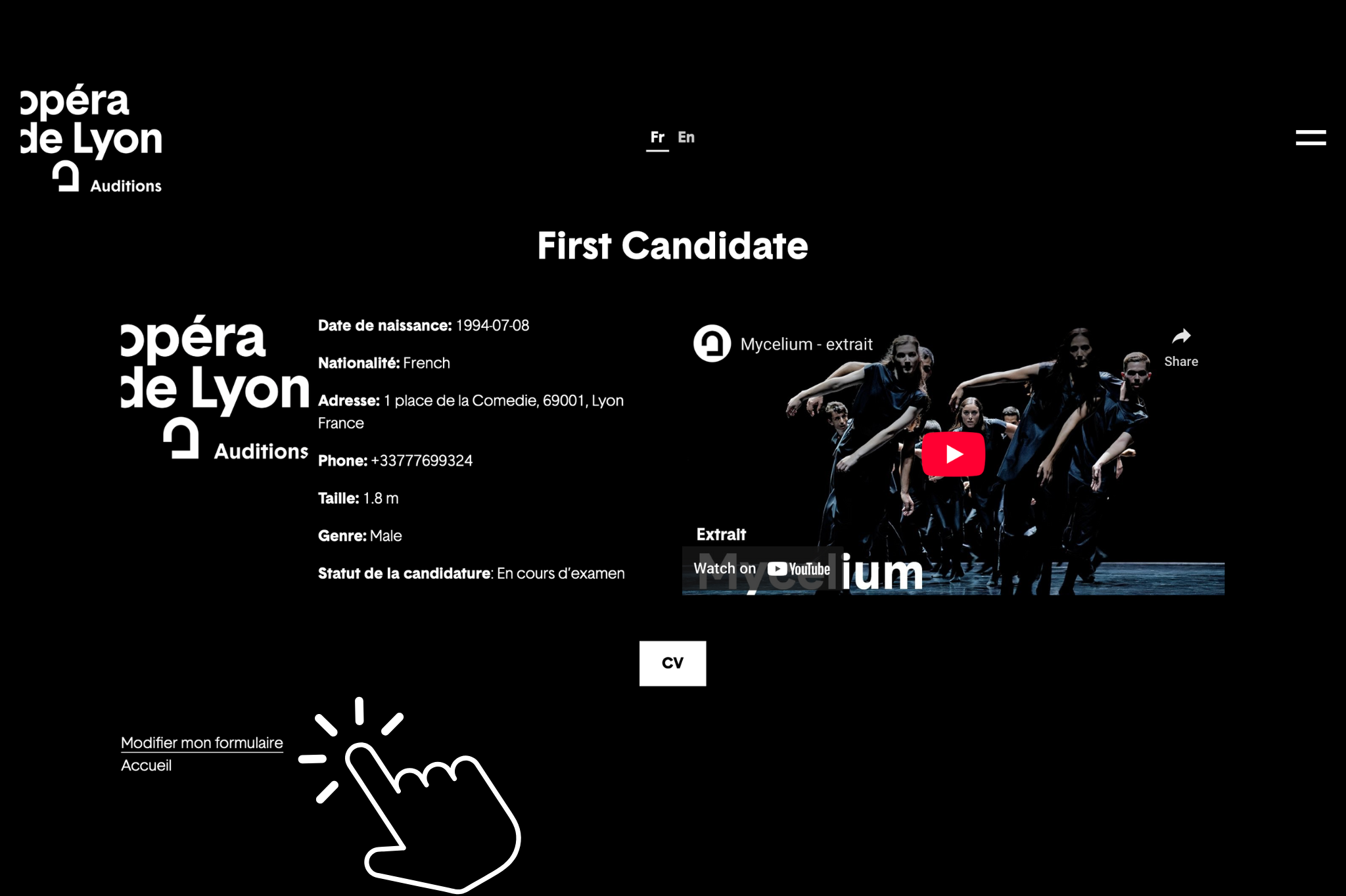 Après avoir créé votre compte, complétez le formulaire de candidature à l’audition. Veuillez fournir des informations précises et détaillées :